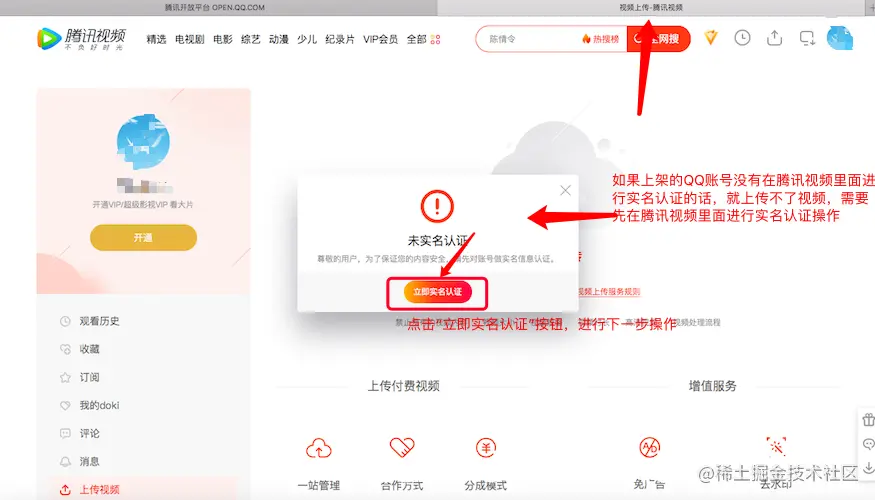 2、如果上架的QQ账号没有在腾讯视频里面进行实名认证的话,就上传不了视频,需要现在腾讯视频的个人中心里面进行实名认证操作,点击“立即实名认证”按钮进行下一步操作。
