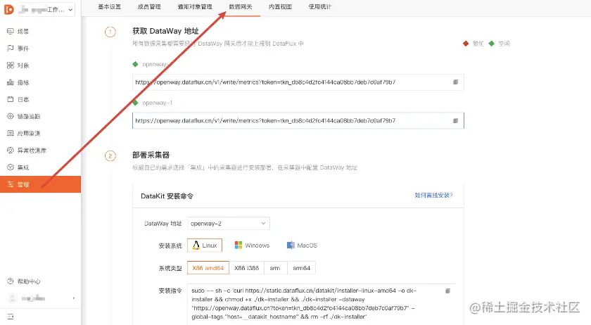 首先,我们登录DataFlux官网注册并登录会员账号,接着可按照下图(控制台-管理-数据网关),或参考链接2找到并安装DataKit。