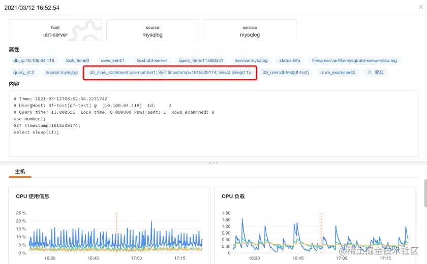 除此之外,我们在拉出来的日志详情中,还可看到当前这台主机在慢日志产生的那个时间点附近(红色虚竖线)的资源占用情况(诸如 CPU、内存、磁盘、网络等信息),在一定程度上能帮助开发人员更好的解决问题。