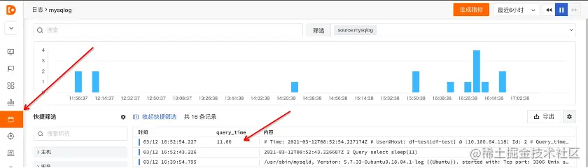 从日志详情图中,我们可以看到红框标记的慢查询 SQL 语句,另外还有其它提取出来的日志信息,比如查询时间、来源、服务器主机名、请求发送的数据行数等信息。