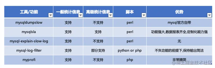 常用的对慢SQL做优化的分析工具有:mysqldumpslow、mysqlsla、mysql-explain-slow-log、mysql-log-filter、myprofi。