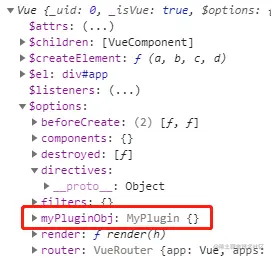在控制台,我们就看到自己写的插件被挂载在 Vue 实例下了。