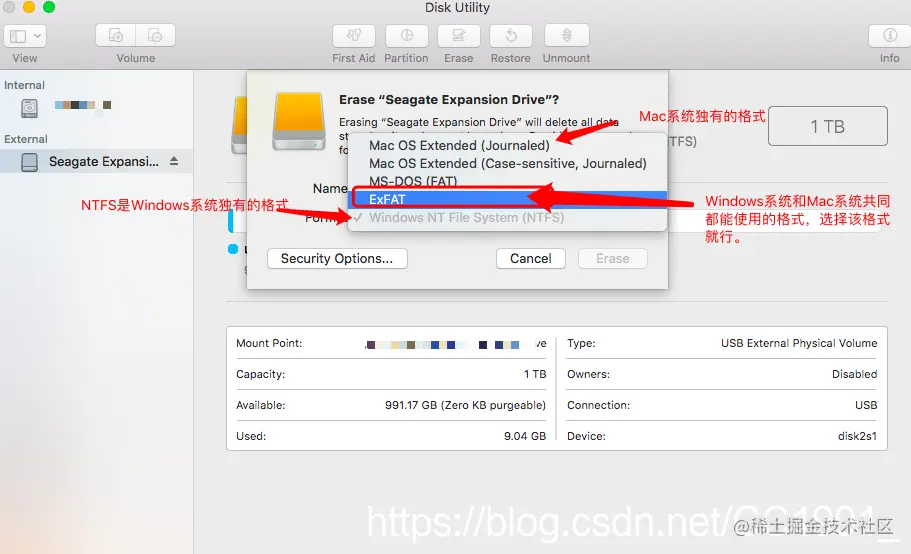 七、在弹出的提示框里面,可以修改移动硬盘的名称,最主要的就是“格式”选项,为了保证Windows系统和Mac系统都能正常使用移动硬盘,就要在格式里面选择二者共同适用的格式,ExFAT格式就是二者共同适用的格式,这个格式一定要选择正确。