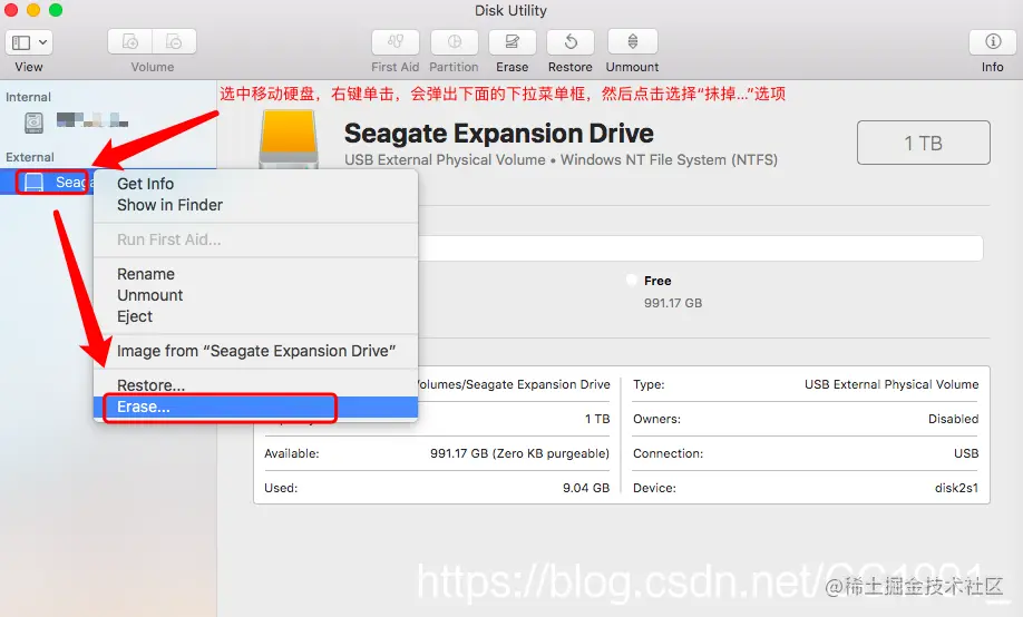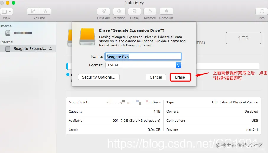 六、选中新移动硬盘,然后右键点击,选择下拉菜单栏里面的“抹掉…”选项,会有一个提示弹框。
