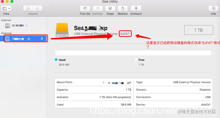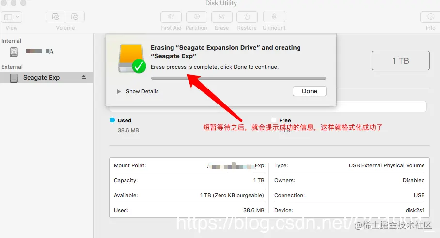 九、然后等待几分钟之后,进度弹框显示成功的提示,就格式化成功了,而且会发现在磁盘工具里面显示的新移动硬盘的格式已经变成“ExFAT”格式,然后为了验证是否可以正常使用,请分别在Windows系统和Mac系统下进行任何一个文件拷贝操作进行验证。