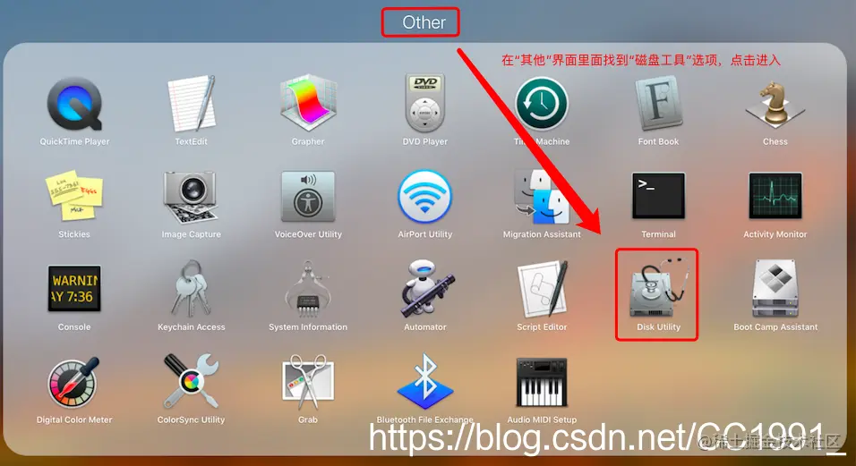 四、在“其他”界面里面,找到“磁盘工具”选项,点击进入。