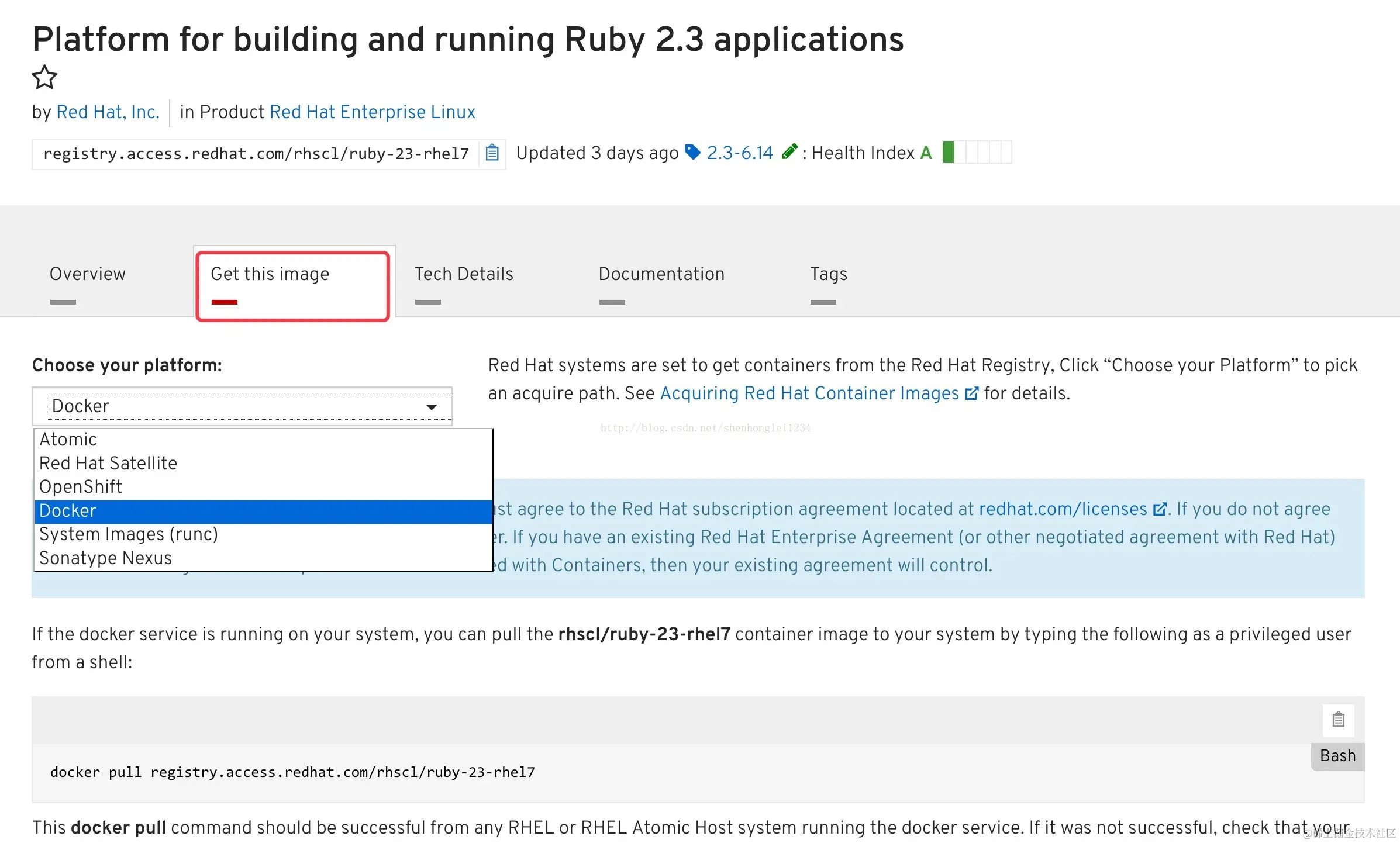 如何从Red Hat官网下载镜像image:Atomic、OpenShift、Docker、Satellite、System Images runc shenhonglei 2021-03-23 164 阅读1分钟 \ 下载镜像文件地址 \ 我选用的是Docker方法下载 \ \ \ \ \ \ \ \ 下载好以后,查询docker中是否存在您下载的image: docker images 然后上传到openshift[todo...] \ \