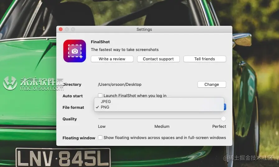 FinalShot将屏幕快照存储为PNG或JPEG文件,如果需要较小的文件,则可以降低画质。