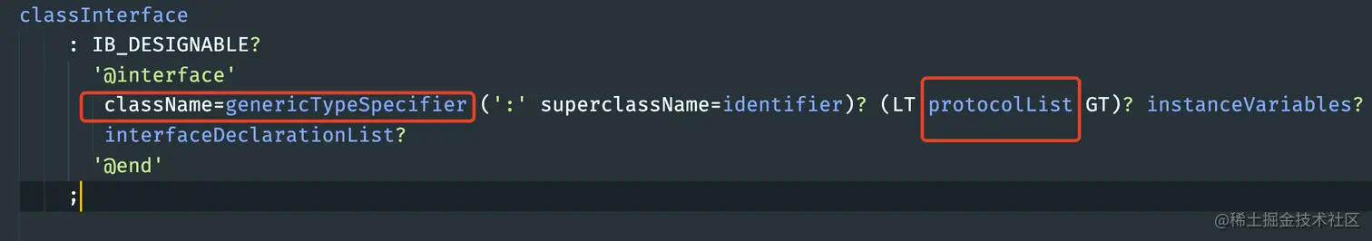 在ObjectiveCParser.g4中classInterface节点的解析规则定义如下: