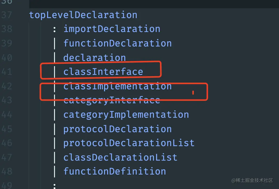 获取到topLevelDeclarationNode之后,再查看ObjectiveCParser.g4中的申明如下: