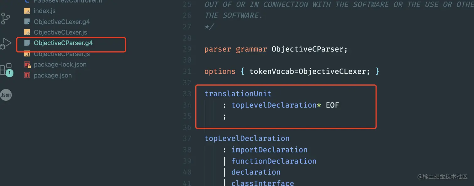 这里的ObjectiveCParser是根据ObjectiveCParser.g4生成的规则解析文件,从ObjectiveCParser.g4中可以到