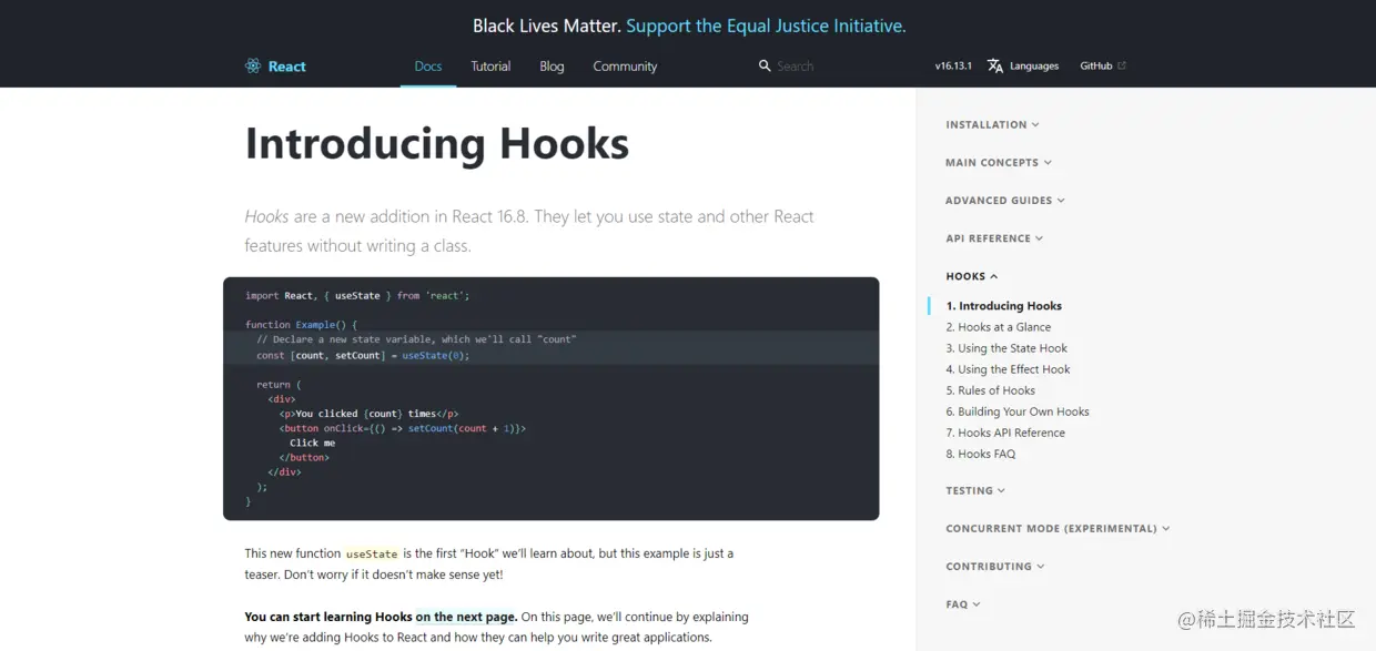 - 网站:reactjs.org/docs/hooks-intro.html