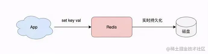 我猜你最容易想到的一个方案是,Redis 每一次执行写操作,除了写内存之外,同时也写一份到磁盘上,就像这样: