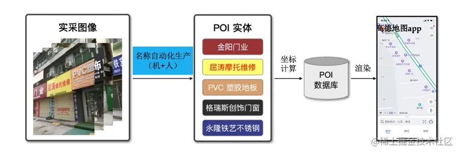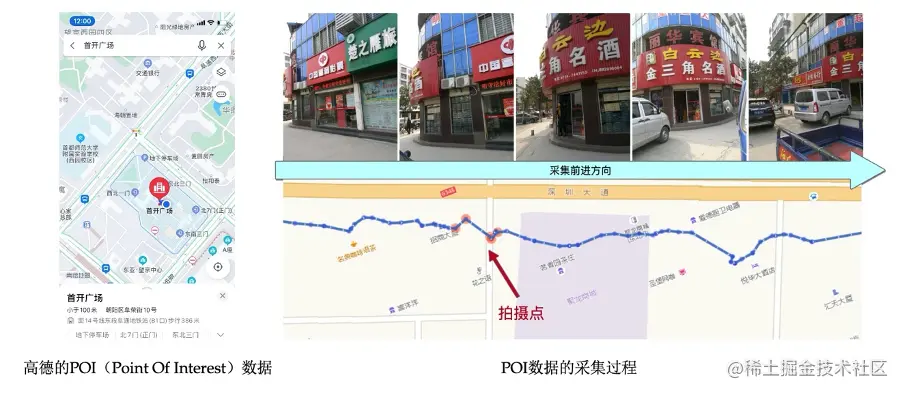 高德有7000万以上的POI(Point of Interest,兴趣点)数据。每年还会出现很多新增的POI,也会有一部分POI停止营业、关门倒闭。**这些POI如何制作和更新?**从采集方式来看会有很多获取POI的方式,有一种重要而且直观的采集方式,高德通过众包方式采集街边店铺的图像,利用计算机视觉技术(以及人工辅助)从图像中提取POI数据。