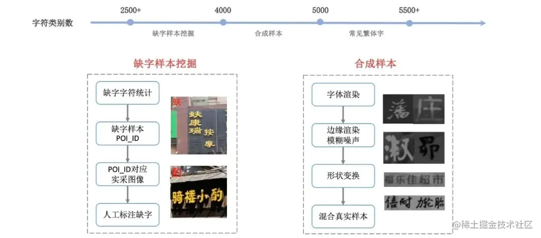针对这个问题,我们有几个不同的解决方案。比如可以从POI的名称里,找到感兴趣的字符,再找到采集图片,再交给人工去标注。也可以通过电脑的字库,加上一些渲染效果,合成一些样本。