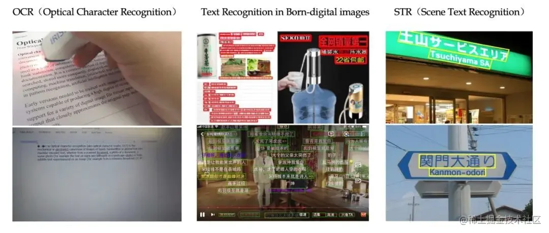 第3列是自然场景的文字识别问题,称为STR,也就是在真实存在的文字,比如店铺名称、路牌,这种文字识别问题,因为拍照的角度问题、光照问题、图片质量问题,应该说难度是最大的。也是现在学术界研究比较多的一种类型。