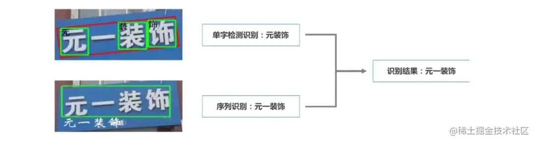在字符识别的环节,可以看到高德是平行使用了两种方案。上面的分支是单字符的检测和识别,下面的分支是整个文本序列的识别。