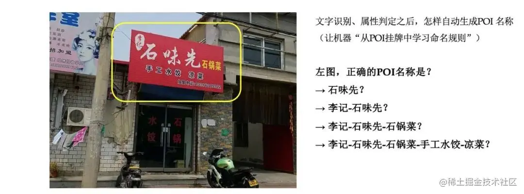 在现实世界中,这个问题的难度并不低。以下方的这个牌子为例,正确的POI名称是什么呢?