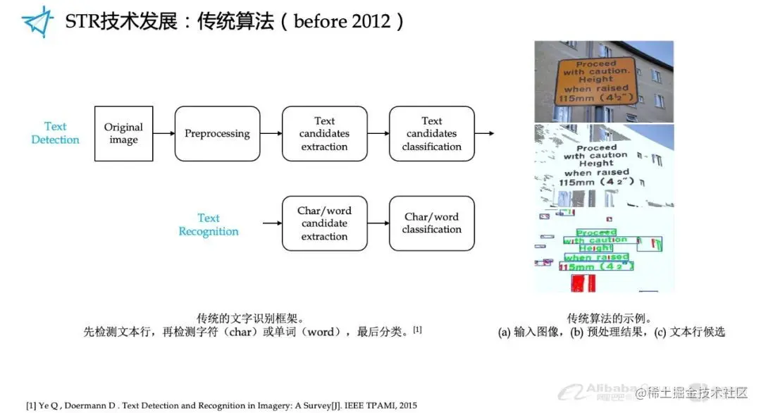自然场景文字识别(STR)的发展大致可以分为两个阶段,以2012年为分水岭,之前是以传统图像算法为主;之后,进入了深度学习算法的阶段。