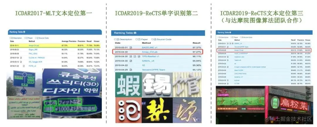 高德是从2016年左右,开始研发文字识别技术,到现在还在持续优化。为了检验技术能力,高德视觉技术团队也参加过一些竞赛。OCR领域比较大的一个竞赛是 ICDAR,高德参加了2017年,2019年的文本行定位、字符识别的比赛,也有一些不错的成绩。
