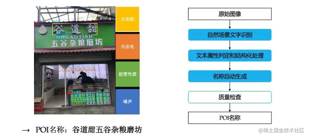 以下图为例,从原始图像,到自动生成POI的名称,包含了以下几项关键的计算机视觉技术:自然场景文字识别、文本属性判定和结构化处理、名称自动生成…