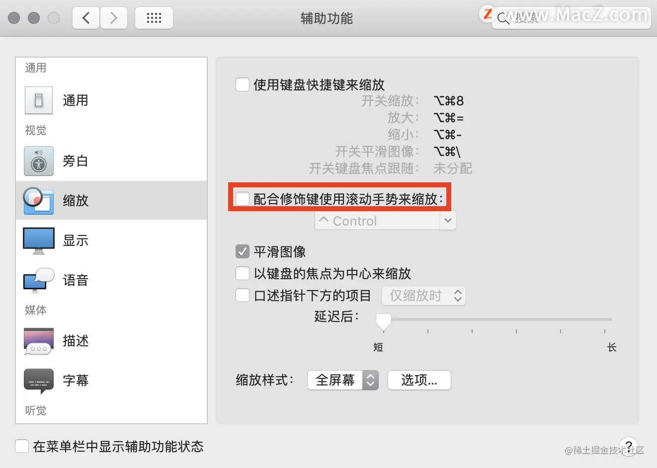 接着将左边切到「缩放」,然后将图中的「配合修饰键使用滚动手势来缩放」这项取消勾选即可