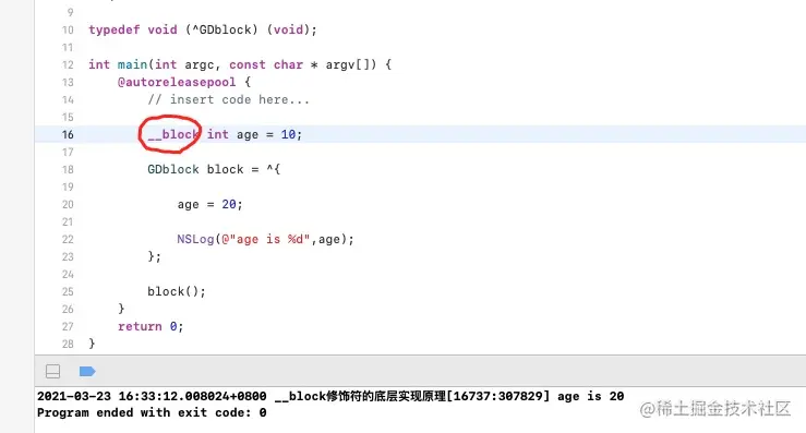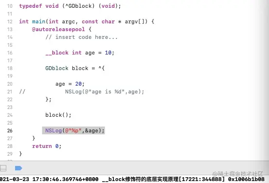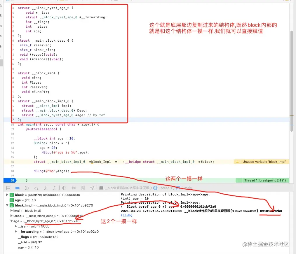 从这里我们可以看出,它并不是block里面存储的age的地址值,这2个值并不是一样,我可以告诉大家,它访问的就是age里面那个age=10的那个age地址,你看下图,我来证明