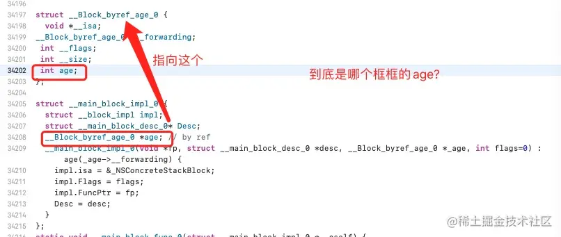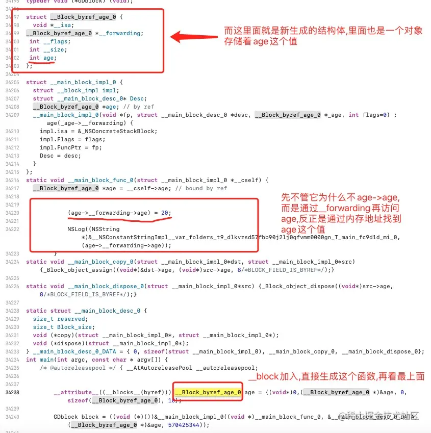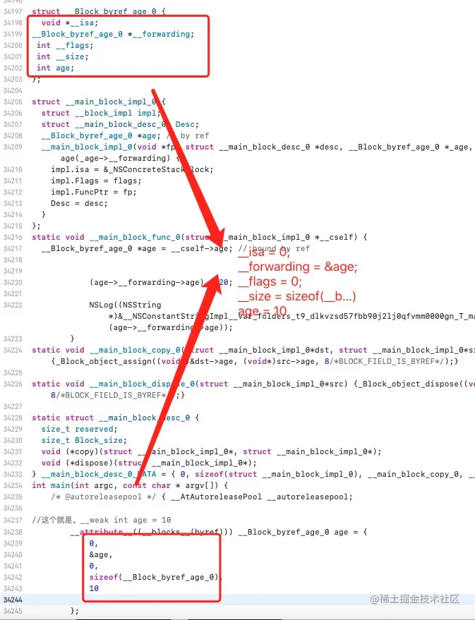 这个赋值非常明显__forwarding赋值的就是&age,sizeof就是当前的结构体有多大,就是赋值size,而且最下面那个框框,他自己定义的age会传给第二个参数&age,赋值给*__forwarding,所以__Block_byref_age_0它的地址就是*__forwarding,这个也非常清楚