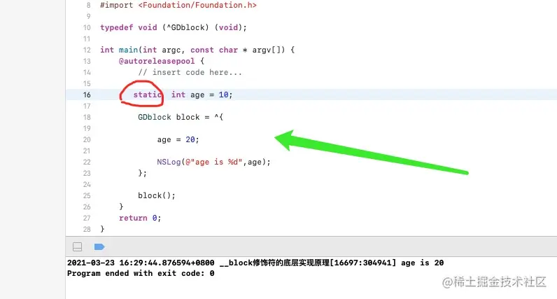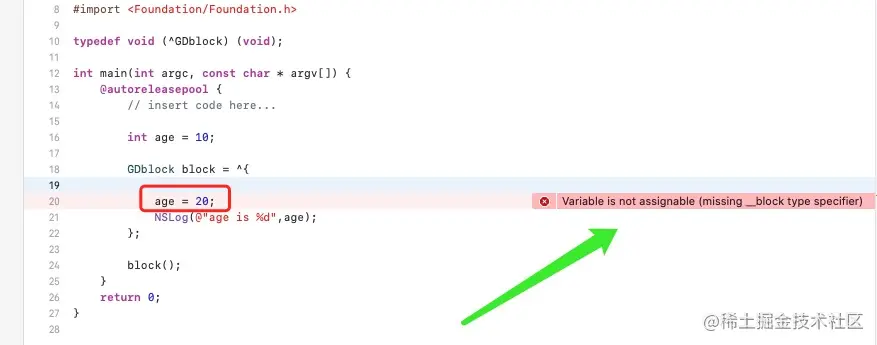 我们想在一个函数里面修改另一个函数的age值,那是不是非常不可能啊,而上面的func_0里面访问的age是之前编译器里面存储的age,跟那个变量没有任何关系,要改也只能改block里面的age,所以我们上面那么写就是有问题.