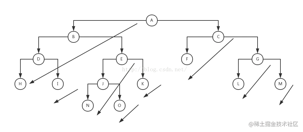 如下图:首先入栈 A-H,出栈 H、D,D 有右节点,入栈 I ,出栈 I,出栈 B,B 有右节点 E,入栈 E-N ;如此循环...