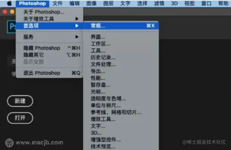 1.打开Photoshop 2020后,点击「菜单栏->Photoshop->首选项->常规」选项。