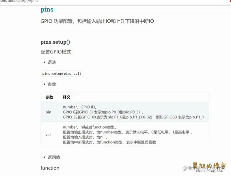 在网页左边选择Luat API接口,可以看到所有接口都被整理好放到了这里,点击LuaTask–pins可以找到我们需要的函数接口: