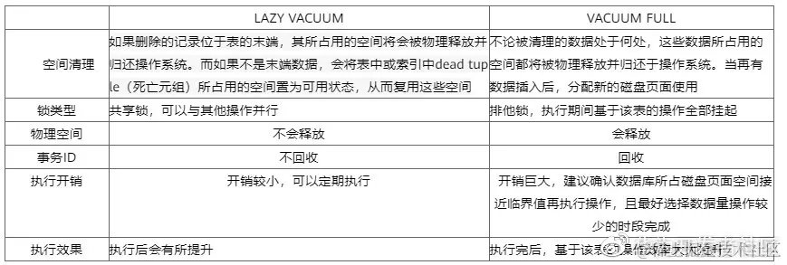 VACUUM 命令存在两种形式,VACUUM和VACUUM FULL,VACUUM命令做的是LAZY VACUUM。从字面意思就可以看出来,LAZY VACUUM是VACUUM FULL的简化版。具体区别见下表。