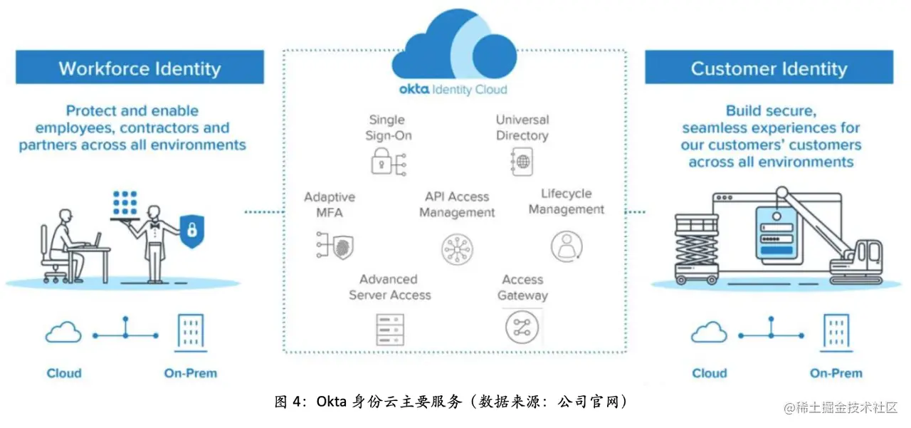 ➢ Okta 为美国多云部署及 SaaS 时代的身份认证管理服务商,成立于 2019 年。 Okta 通过兼收并购,快速获得核心技术和人才,将业务由最初的单点登录(SSO)逐渐扩张至 IAM 全领域,并同时服务于 B2E、B2C、B2B 全场景与全生命周期。