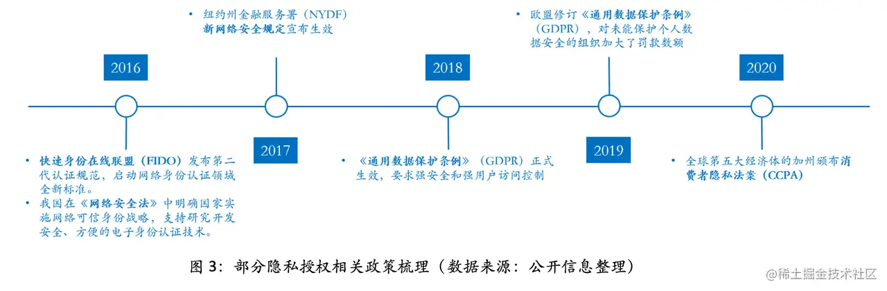 ➢ 隐私授权政策加速落地,助推身份安全管理海量需求: 2016 年,快速身份在线联盟(FIDO)发布了第二代认证规范,启动了网络身份认证领域的全新标准。我国在《网络安全法》中明确了国家实施网络可信身份战略,支持研究开发安全、方便的电子身份认证技术。2019 年,欧盟修订了《通用数据保护条例》(GDPR),对未能保护个人数据安全的组织加大了罚款数额。2020 年,作为全球第五大经济体的加州颁布了消费者隐私法案(CCPA)。