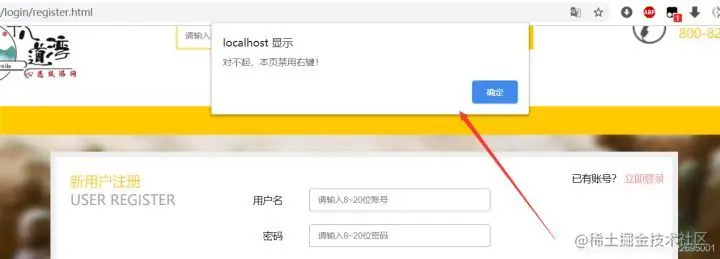 我们通过 JS 中的 button 事件属性来实现鼠标右键的禁用。通过弹出提示框来代替右键选项卡。