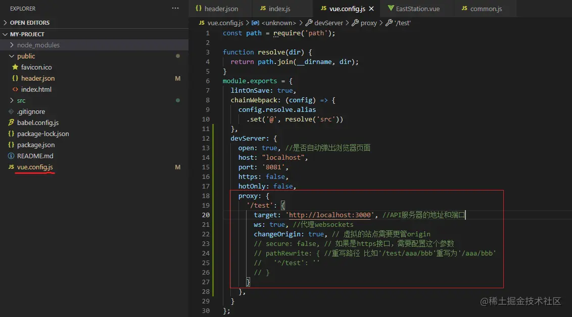 1. 因为端口不同,所以先进行跨域配置,基于vue-cli3, 如图所示