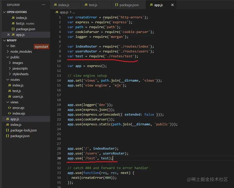 1. 在 routes 文件夹下新建test.js 文件。