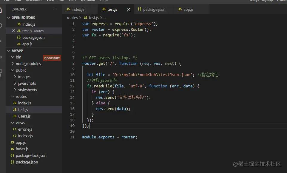 var express = require('express');var router = express.Router();var fs = require('fs');/* GET users listing. */router.get('/', function (req, res, next) { let file = 'D:\\myJob\\nodeJob\\testJson.json'; //指定路径 //读取json文件 fs.readFile(file, 'utf-8', function (err, data) { if (err) { res.send('文件读取失败'); } else { res.send(data); } });});module.exports = router;