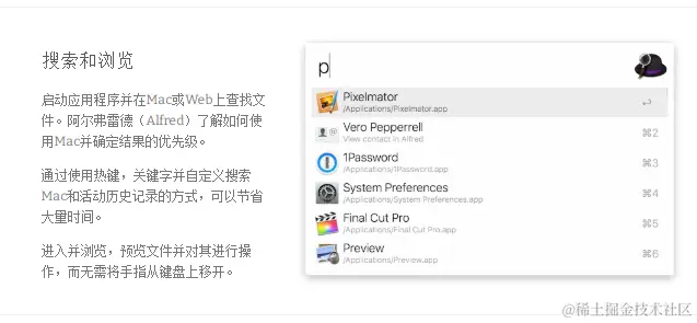 Alfred 可以管理你的电脑,快速打开各种网页,进行文件管理。作为入口,它做得很不错。可以直接搜索我的收藏夹、本地文档(甚至 PDF 内容)、github、api 文档。极少找不到的时候,回车就跳到 google 搜索,可以结合许多 workflow 自定义自己要做的很多事情,之后用一个搜索框就能解决问题。