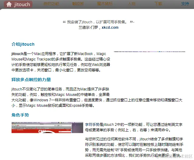 因为苹果说,MacBook不会配备支持多点触控的显示屏。所以这个任务落在了一直存在的触控板上,Jitouch帮助用户增强触摸板手势,为Magic Mouse自定义多种手势操作,点点手指就能切换标签页等等。