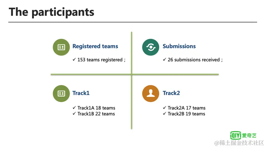 ****爱奇艺高级经理李海首先在报告会开场进行了致辞,现场回顾了整个大赛的过程:全球共有153支队伍参赛,共提交26个参赛方案,并现场公布了4个赛道排名top2的队伍。