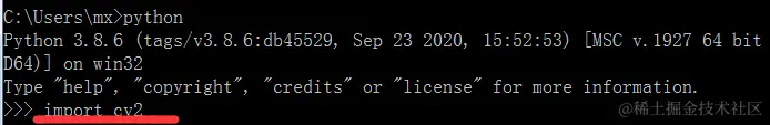 安装完成后可以在cmd黑框框中进入python命令的交互界面,引入opencv即可知道是否已经安装成功。步骤如下: