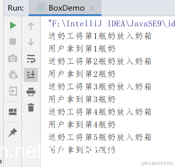 System.out.println("送奶工将第" + this.milk + "瓶奶放入奶箱");