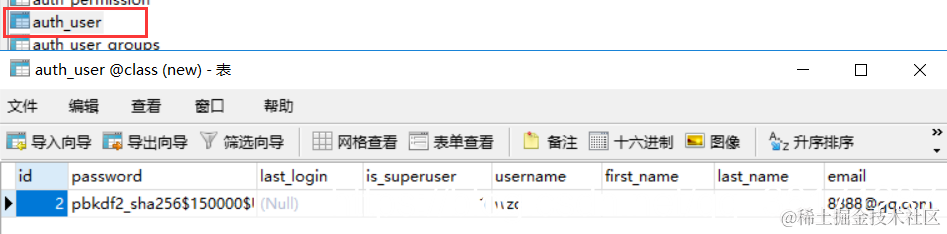 刚刚创建的超级用户信息存储在数据库的auth_user表中