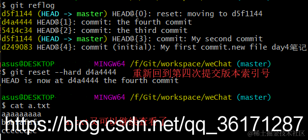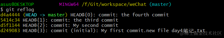 使用git reflog命令会多出一个HEAD@{0} 这是说明移动到这个记录需要0步,如果是{2}则说明需要两步