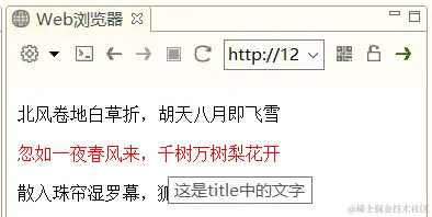 <p title="这是title中的文字">忽如一夜春风来,千树万树梨花开</p>