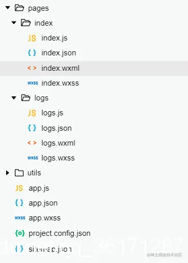 .json后缀的JSON配置文件.wxml后缀的WXML模板文件.wxss后缀的WXSS样式文件.js后缀的JS脚本逻辑文件