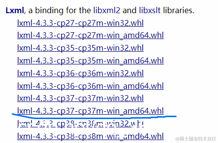 然后从官网下载相对应的lxml版本,我使用的是python3.7版本