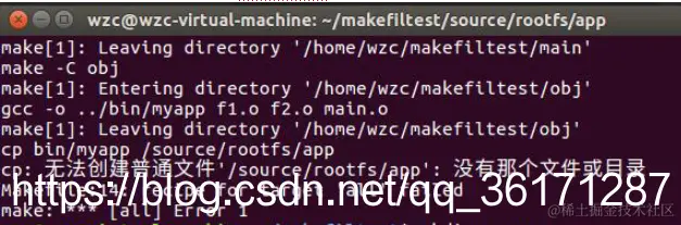 10、输入make去运行makefile文件,发现错误cp无法创建普通文件